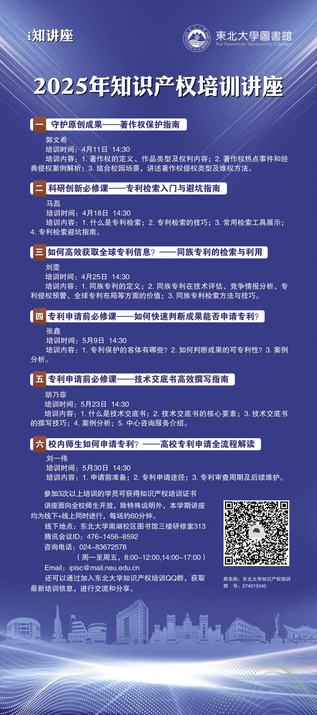 温馨提示欢迎各位师生通过线下或线上的方式参与本学期知识产权培训讲座,参加3次以上的学员可获得知识产权培训证书。各位老师或同学如有知识产权方面培训需求,可以通过以下方式进行预约:联系电话:024-83672578