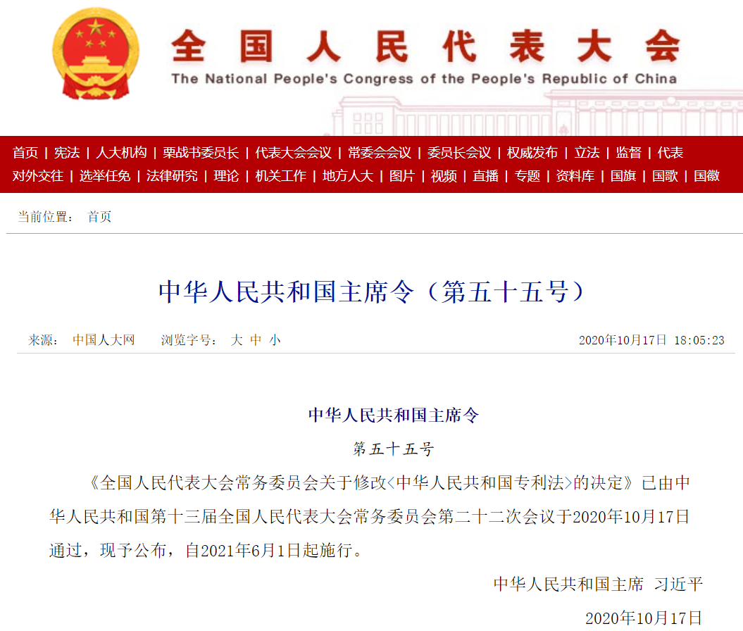 2020年10月17日,中华人民共和国第十三届全国人民代表大会常务委员会第二十二次会议通过《全国人民代表大会常务委员会关于修改〈中华人民共和国专利法〉的决定》。修改后的专利法自2021年6月1日起施行。