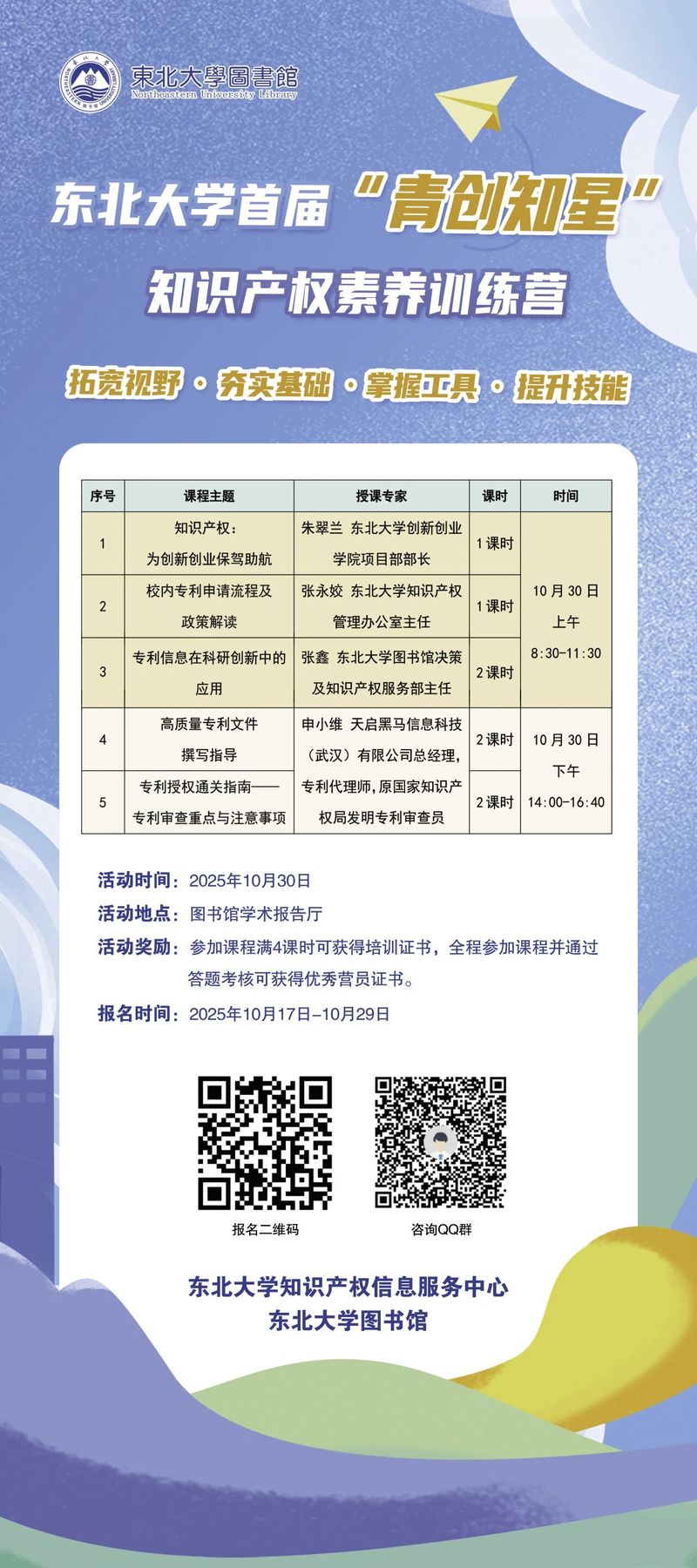 知识经济时代,知识产权的重要性日益凸显。对于高校学生而言,知识产权已成为保护创新成果、提升科研价值、助力创业成功的重要手段。为提升我校学生的知识产权保护意识与运用能力,营造尊重知识、崇尚创新的校园文化氛围,东北大学知识产权信息服务中心、东北大学图书馆联合东北大学创新创业学院、东北大学科学技术研究院,于10月30日举办“东北大学首届‘青创知星’知识产权素养训练营”。本期训练营将通过系统实用的课程,为你的学术研究与创新创业保驾护航!